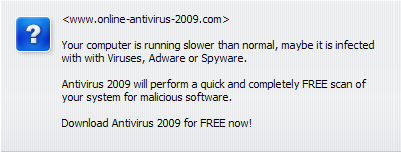 Для распространения псевдоантивирусов мошенники используют и рекламу в интернете. В настоящее время множество сайтов размещают баннеры с информацией о новом «волшебном» продукте, который избавляет от всех проблем. Даже на каком-либо легальном ресурсе с большой долей вероятности можно увидеть мигающий баннер или навязчивую флэш-рекламу «нового антивируса». Кроме того, при веб-серфинге в окне браузера пользователя могут появляться всплывающие окна с предложением бесплатно загрузить антивирус. Пример одного из таких окон представлен на скриншоте ниже.