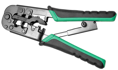 Процесс закрепления кабеля в коннекторах называется обжим. Выражение «обжать витую пару» означает буквально: оголить концы кабеля, вставить их в нужном порядке в коннектор и хорошенько зажать специальным инструментом. Это инструмент называется обжимной инструмент или кримпер и выглядит так: