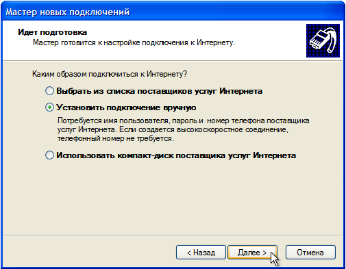 5. Из предлагаемых вариантов выбираем «Установить подключение вручную». Нажимаем «Далее».