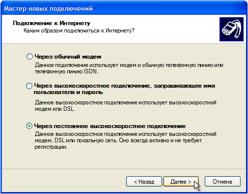 6. Из списка способов подключения к Интернету выбираем «Через постоянное высокоскоростное подключение» и нажимаем кнопку «Далее».
