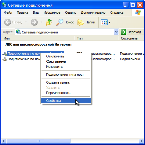 2. Правой кнопкой мыши щелкаем по подключению к Интернету (на моем компьютере оно называется «Подключение по локальной сети 2», у вас может называться по другому) и выбираем в списке «Свойства».