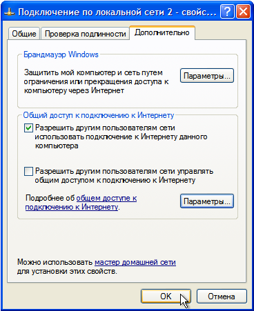 Собственно говоря, нам осталось лишь заставить компьютер №1 пускать в сеть компьютер №2, а тому в свою очередь объяснить, что интернет находится в распоряжении ПК1. Рассмотрим последовательность действий для достижения этой цели.