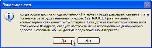 Нажимаем кнопку «Да». Компьютеру автоматически будет присвоен адрес 192.168.0.1 (теперь вы, надеюсь, поняли, почему не нужно было присваивать адрес компьютеру вручную на этапе создания сети – Windows сделала всё за нас).