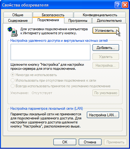 2. Переходим на вкладку «Подключения» и нажимаем кнопку «Установить».