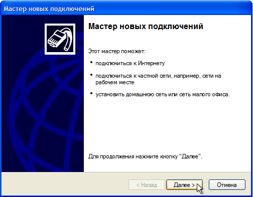 3. Запустится Мастер новых подключений. Нажимаем кнопку «Далее».
