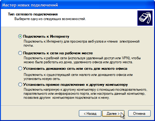 4. Выбираем тип сетевого подключения – «Подключить к Интернету» и вновь нажимаем кнопку «Далее».