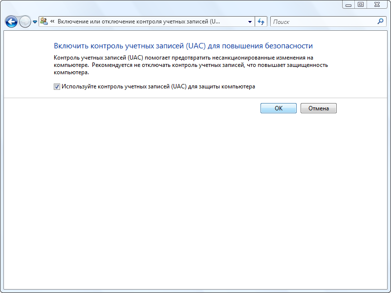Также имейте в виду, что в ОС Windows Vista и в Windows 7 есть замечательный инструмент «Контроль учетных записей», который спрашивает ваше подтверждение при установке приложений, запуске консоли управления ОС и изменении параметров Windows. Именно эти надоедливые окошки, в которых мы постоянно жмем «Разрешить» или «Продолжить» могут стать первым препятствием на пути вируса. Поэтому проверьте, что Контроль учетных записей (сокращенно «UAC») включен в настройках вашей системы. Для этого перейдите в «Панель управления» - «Учетные записи пользователей» и нажмите ссылку «Включение или отключение контроля учетных записей (UAC)». В случае отсутствия здесь галочки, установите ее и нажмите «ОК».
