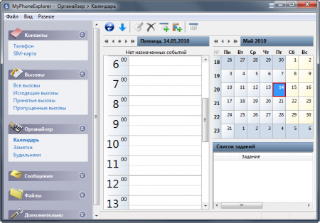 MyPhoneExplorer 1.8.8 - бесплатная утилита, позволяющая с легкостью управлять содержимым телефонов Sony Ericsson и Android-коммуникаторов через кабель, bluetooth, Wi-Fi или инфракрасный порт. Программа предоставит вам возможность работы с адресной книгой, управлять записями в календаре, работать с SMS (создавать копии, экспортировать, импортировать и т.д.), просматривать файлы на телефоне, синхронизировать часы, редактировать профайлы и многое-многое другое.
