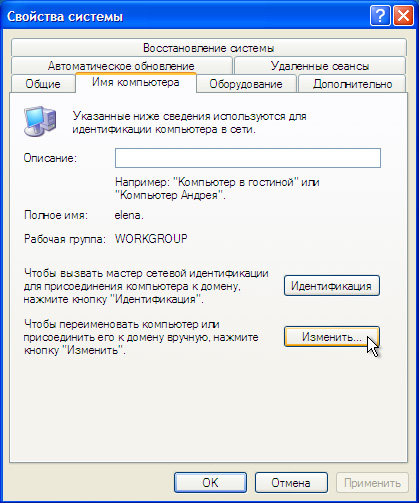 2.В открывшемся окне выберите вкладку «Имя компьютера» и нажмите кнопку «Изменить…».
