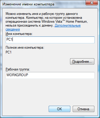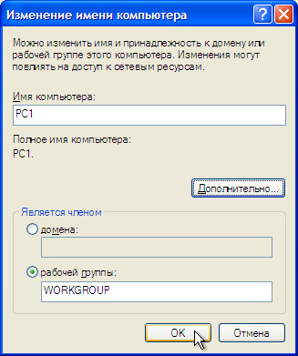 3.Введите имя компьютера на английском языке – PC1 и имя рабочей группы – WORKGROUP. Имя рабочей группы может быть уже указано (по умолчанию оно одинаково для всех компьютеров под ОС Windows). В таком случае просто проверьте, чтобы оно было WORKGROUP.