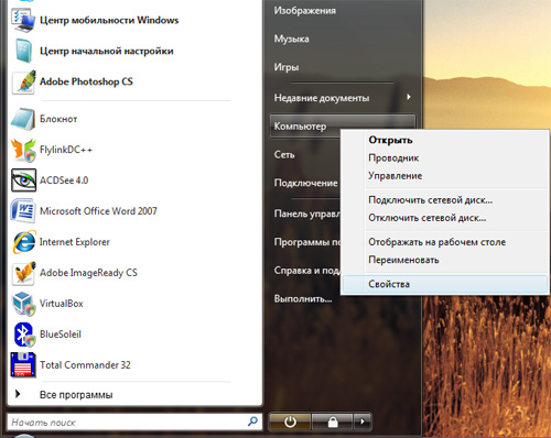 1.На ПК1 откройте меню «Пуск», щелкните правой кнопкой мыши по надписи «Компьютер» и выберите «Свойства».