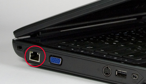 У ноутбуков порт сетевой карты обычно находится сбоку - справа или слева.
