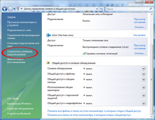 2.В списке выберите раздел «Центр управления сетями и общим доступом». В открывшемся окне нажмите «Управление сетевыми подключениями».