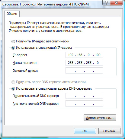 5.Отметься пункт «Использовать следующий IP-адрес» и введите в поле «IP-адрес» адрес вашего компьютера – 192.168.0.100