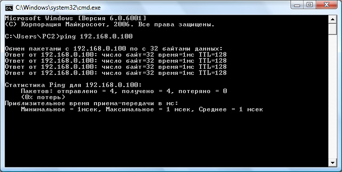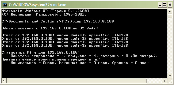 2.Откроется командный интерпретатор Windows. Наберите в командном интерпретаторе ping 192.168.0.100 и нажмите на клавиатуре Enter. Связь есть: ПК2 отправляет пакеты, а ПК1 отвечает на них.