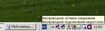 Теперь займемся настройкой программной части. Данная инструкция по подключению показывает настройку беспроводной сети под операционной системой Windows XP; на других операционных системах процесс будет немного отличаться.  Изначально на каждом компьютере иконка беспроводного сетевого подключения перечеркнута красным крестом, т.е. беспроводное подключение недоступно..(Рис.1). Вторая активная иконка на этом рисунке -это проводная локальная сеть, она в работе, но к данной теме не относится, поэтому на нее больше не обращаем внимания.
