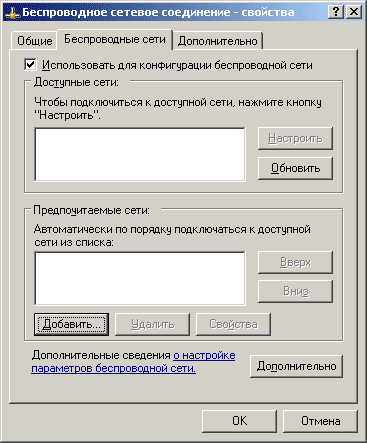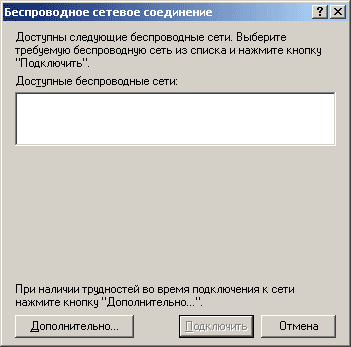 В появившемся окне (рис.2) у меня изначально доступных сетей нет. Теоретически в списке сетей уже может быть какое-нибудь имя при условии что поблизости от Вас (в пределах 100м) уже работает настроенная беспроводная сеть, но здесь и далее не будем усложнять, учитывая что на практике беспроводные сети у нас скорее исключение чем норма, а предназначение данной статьи  - быстрое практическое пособие о том как добиться соединения двух компьютеров без проводов, не вдаваясь в подробности.. Поэтому жмем на "Дополнительно.." (Рис.2) и переходим к следующему окну (Рис.3)