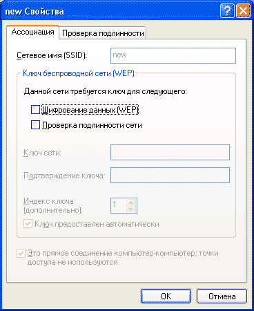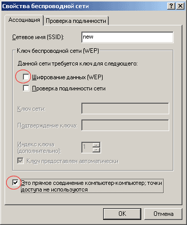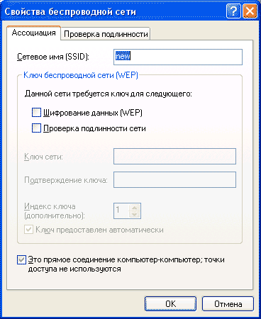 В новом окне (Рис.4) вводим имя будущей сети (я придумал "new") и два важных момента: убираем галочку возле "шифрование данных (WEP)" и отмечаем что "это прямое соединение компьютер-компьютер... :Жмем "OK"..