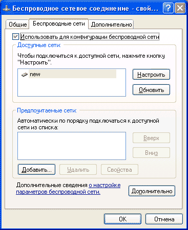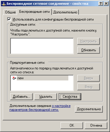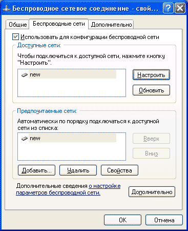 Сеть "new" попала в список предпочитаемых сетей. Для проверки нажмем "Свойства" - окно свойств должно соответствовать рис.16.