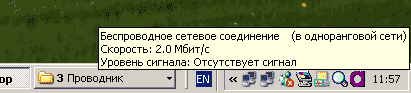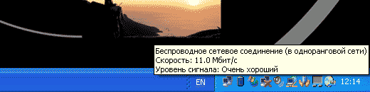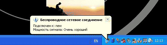 Все. Подключение второго компьютера к сети "new' состоялось. Выходим из всех окон (нажимаем "OK"). На иконке беспроводного сетевого соединения кратковременно появится сообщение об успешности подключения (Рис.17), теперь она активна (без красного креста)..