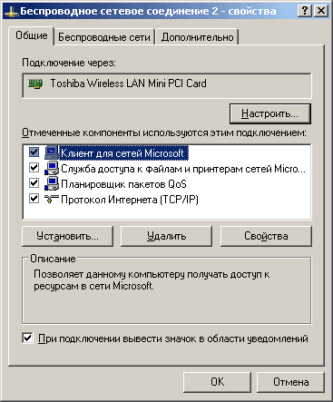 Скорость подключения 11.0Мбит/c - максимальная для стандарта Wi-Fi (802.11b) и говорит о том что все сделано правильно.. Осталось только  настроить протокол TCP/IP по которому будет происходить обмен данными с первым компьютером. Для этого жмем "Свойства" и по точной аналогии с первым компьютером (рис.8 и рис.9) задаем IP-адрес и маску подсети для второго компьютера (IP адрес второго должен отличаться последней цифрой, например 192.168.0.2, а маска подсети должна быть идентичной). Проверяем ping заданных адресов со второго компьютера (оба IP адреса должны давать отклик). Сеть для обмена данными готова. Организуем доступ сетевых ресурсов (в свойствах жёсткого диска или папки).  И всё!