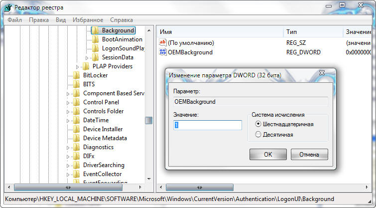 HKEY_LOCAL_MACHINE\SOFTWARE\Microsoft\Windows\CurrentVersion\Authentication\LogonUI\BackgroundКак видите, в правом окне есть значение OEMBackground. Дважды на нем щелкните и введите в поле Значение цифру 1. Щелкните на кнопке ОК.