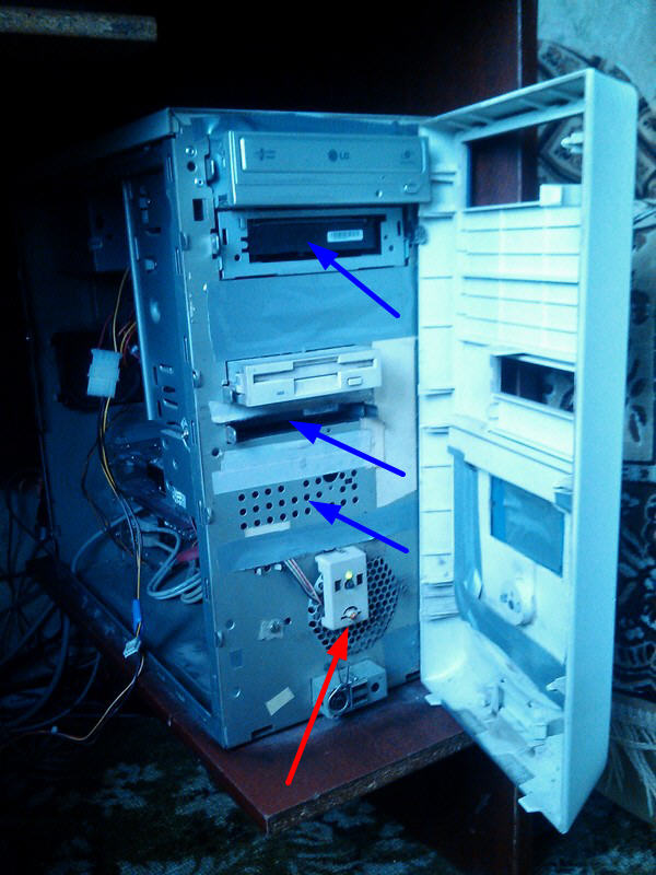 А вот штатный корпусной вентилятор (указан красной стрелочкой) я развернул, т.е. "дует" он теперь не в корпус, а из корпуса. Синими стрелочками указаны места установки жестких диков. Все отверстия (дыры, щели) в самом корпусе и облицовочной панели заклеил скотчем, оставил лишь те отверстия, за которыми установлены диски. Т.е., между самим корпусом и передней панелью получился воздуховод, в который нагнетает воздух перевернутый штатный вентилятор, и из которого нагнетаемый воздух попадает на жесткие диски.