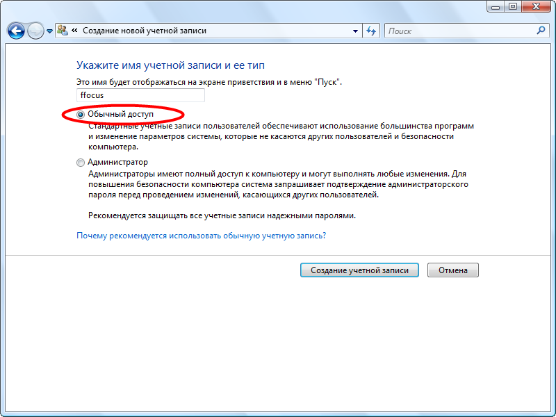 Как же поступить? Логично иметь на компьютере несколько учетных записей пользователей: одну с правами Администратора и одну (или более в зависимости от того, сколько людей работает на ПК) с ограниченными правами. Создать их можно через меню «Пуск» - «Панель управления» - «Учетные записи пользователей». Уверена, что учетная запись с правами Администратора там уже присутствует. При создании новой учетной записи, вам следует выбрать тип учетной записи «Обычный доступ».