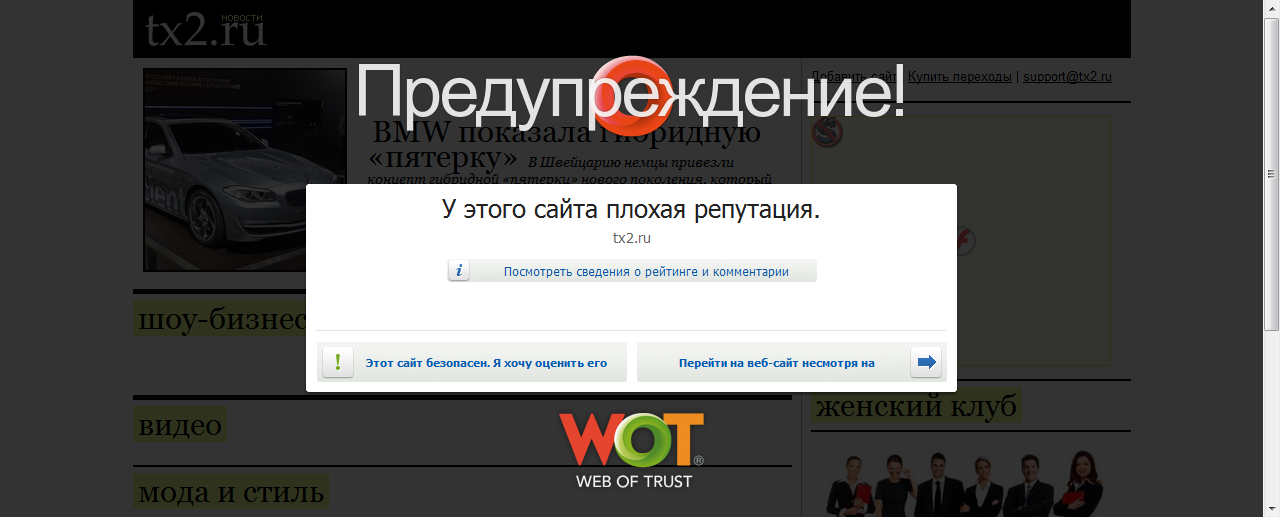 4.Не посещайте сомнительные сайты и не загружайте подозрительные программы из интернета. Красивый ролик можно посмотреть на Youtube, а не на сайте Вани Пупкина, плагин Adobe Flash Player можно загрузить с сайта компании Adobe, а не по ссылке во всплывающем сообщении с ресурса сомнительного содержания. Во многом проверить статус и надежность сайта вам поможет дополнение WOT для Firefox, которое выдает сообщение при переходе на подозрительные и мошеннические сайты, а также особым значком выделяет сайты с плохой репутацией в результатах выдачи поисковых систем.