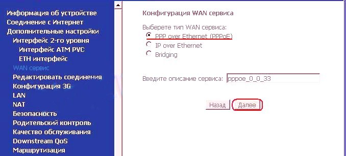 Если Вам нужно настроить модем в режим маршрутизатора (Роутер) — выбираем PPPoE и нажимаем Далее: