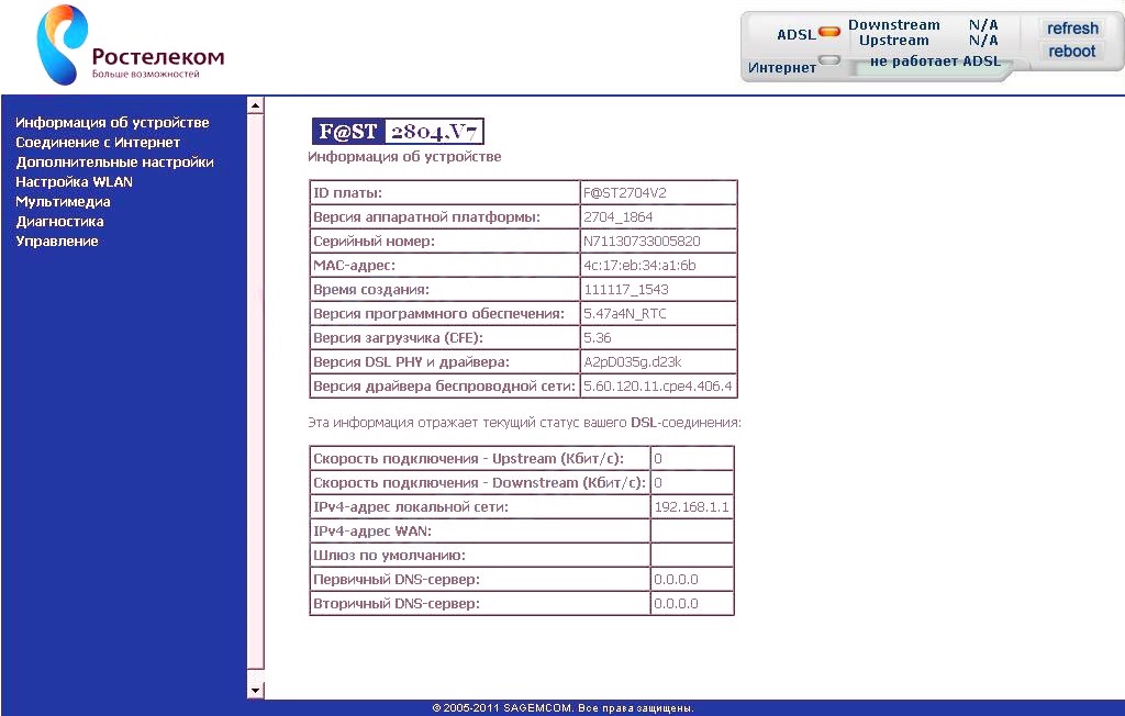 По настройке каких-то особых сложностей Sagem FAST 2804 не вызывает, тем не менее веб-интефейс немного запутан. Адрес устройства в сети стандартный — http://192.168.1.1, логин admin и пароль admin. Пароль для superadmin - Is$uper@dmin.