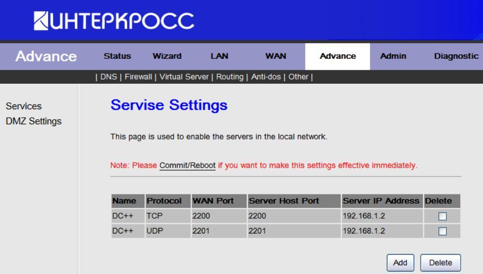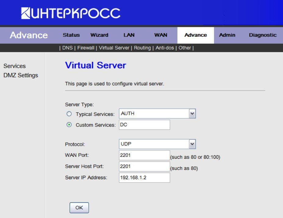 Далее ниже в поле Protocol выбираем протокол – TCP или UDP. Сделаем 2 правила – для обоих протоколов. Выбираем сначал TCP, далее WAN Port ставим в диапазоне от 1 до 65535. например 2200. Server IP Address так же ставим 2200. Жмем ОК. Вновь попадаем на предыдушее меню и снова жмем Add.