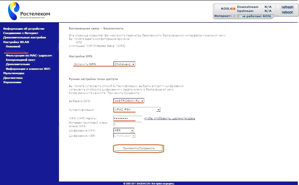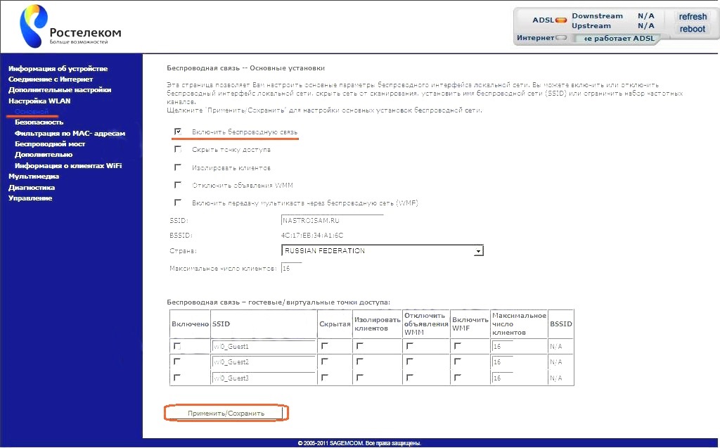 Настройка беспроводной сети на sagemcom 2804 находится в разделе Настройка WLAN. Включается беспроводной модуль во вкладке Основной установкой галочки Включить беспроводную связь: