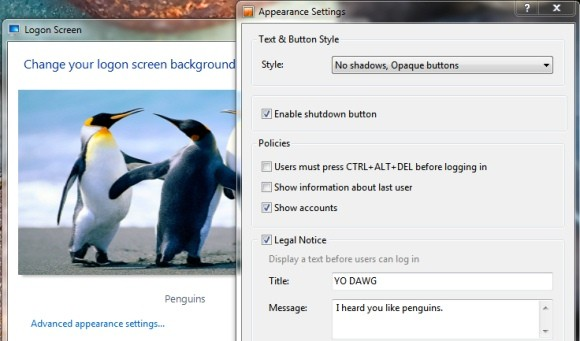 Logon Screen - утилита, позволяющая пользователю настроить по собственному вкусу экран приветствия Windows 7. С помощью программы можно устанавливать различные фоновые изображения, добавлять всплывающие сообщения при входе в систему, изменять стиль текста и кнопок. Также присутствует возможность убрать кнопку завершения работы, отключить требование нажатия Ctrl+Alt+Del и прочее. Logon Screen интегрируется в систему и может быть запущен из контекстного меню на Рабочем столе.